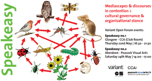 Speakeasy Mediascapes & discourses in contention > cultural governance & organisational stance Variant Open Forum events: Speakeasy no.1 Glasgow - CCA (Club Room) Thursday 22nd May | 18:30 - 21:30 Speakeasy no.2 Aberdeen - Peacock Visual Arts Saturday 24th May | 14:00 - 17:00 Dear cultural practitioners, artist-run and self-organised groups, co-operative and collaborative practices, You are invited to participate in a dialogical workshop to explore your experiences and concerns over discursive practices and organisational stance in the arts in Scotland, and how these relate to self-organised and co-operative practices. These two workshops form part of Variant’s current enquiry (part-funded by Creative Scotland) into how changes in cultural governance correlate with our communication and mediascapes, and how these impact cultural practices. Speakeasy follows on from Variant’s range of discussions, articles and workshops over recent years concerning the sites and situations of communication, as well as an interest in our own and others’ form of self-organisation in a rapidly restructuring cultural field (and ever louder calls for resilient business models). In our wider enquiry we are exploring (a) the conditions for discursive practices in the arts in Scotland, especially through contextualising artist-run organisational forms; we are asking (b), by means of a dialogical process, how such practices can (still?) facilitate (political) agency; and we are interested (c) in finding out more about present and future collaborative organisational models. A couple of years ago, in 2011, our editorial introducing the responses to the interview with (former) Creative Scotland CEO Andrew Dixon observed that, “the dismantling and overwriting of the previous infrastructure will undoubtably leave its mark on artists, creative practitioners and arts organisations throughout Scotland. Whether experienced directly through a loss of funding or an inability to maintain activity through diminishing planning horizons and increasingly precarious labour arrangements, including the formalisation of debt, or indirectly through the demise of a sufficiently diverse cultural scene, the impacts will be manifest. The extent to which impacts will be felt, not only for the short-term viability of practice but to the long-term boundaries of what is and what can be constructed through cultural funding, becomes all too clear when the protection of a Traditional Arts, whilst all else is left to compete in an entrepreneurial ‘creative economy’, is coupled with a new language which narrowly articulates the criteria for artistic practice. It is difficult to ignore the feeling that we are witnessing the formation of ‘legitimate’ subjects of art and culture and a re-imagining of what it means to use those very words. It is impossible to ignore the sense that this is a challenge to the diversity of cultural and therefore political expression as a democratic right.” (“Language is never neutral”, Variant, issue 42, Winter 2011) With ‘communication’ and ‘language’ having, in many ways, taken centre-stage in the re-articulation of access to cultural funding and influence (such as the Open letter to the the (former) chair of Creative Scotland’s board, Sir Sandy Crombie, signed by 100 Scottish artists, or Creative Scotland’s Open Sessions) we intend to examine what has remained at stake in these accentuations. What has been the context and situation that artist-run organisations, and others who attend to self-organised forms, have found themselves in? The sessions will follow similar formats: members of Variant will introduce and facilitate a dialogue that moves between large group and smaller table-based discussions. We will draw on different materials and experiences to enquire into their range, resonance and divergence; to then explore in more detail the spaces for dialogue in relation to artist-run, self-organised and other collaborative practices. We are able to reimburse travel costs for participants who travel from the Central Belt to the Glasgow meeting and from the Northeast to the Aberdeen meeting and who have no alternative sources for reimbursement (please bring the ticket or receipt with you). We are conscious of the need for careful attention to the ethics of what can be said, by and with whom. We will neither audio nor video record these session, but we would like to engage in a dialogue as to how any material generated can form part of our enquiry. The meetings are open and free to attend but please let us know that you are intending to join us by emailing Variant at : variantmag@btinternet.com |